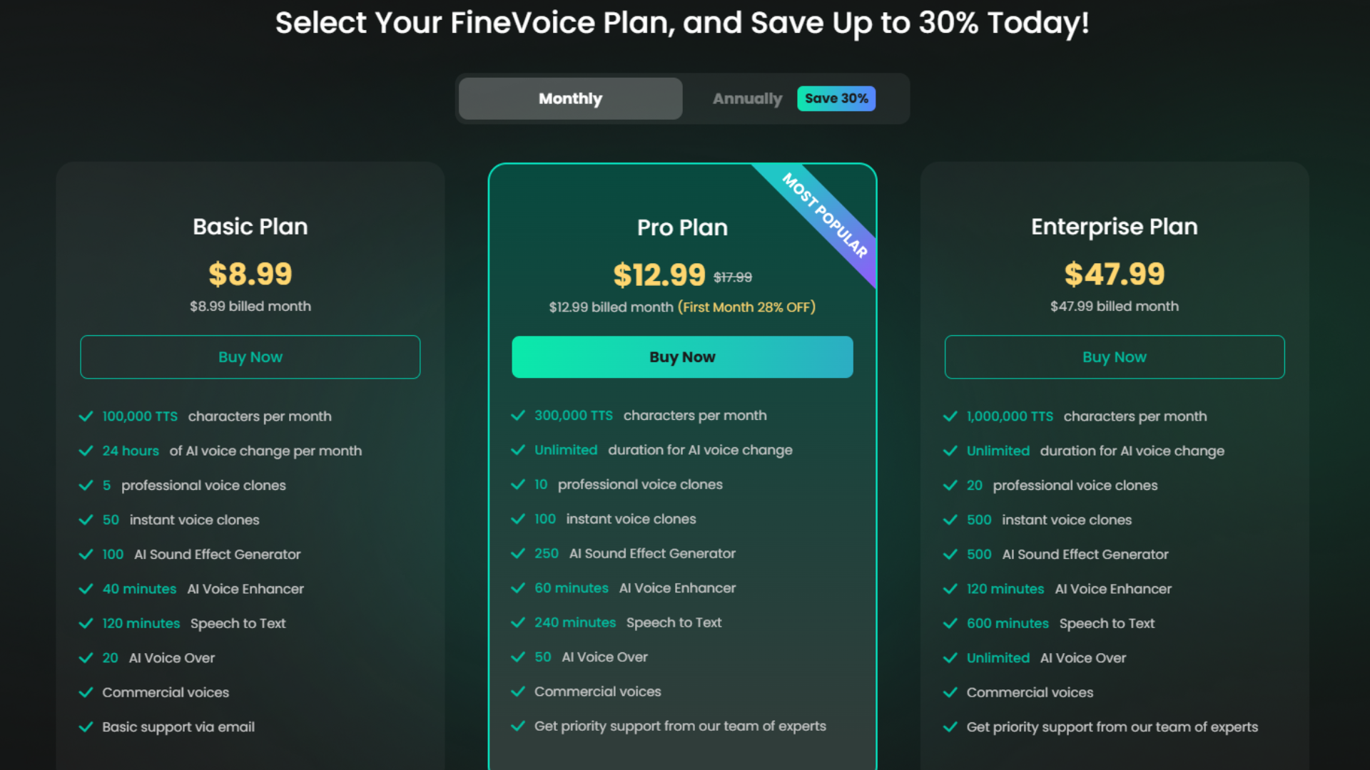 One of the key advantages of FineVoice pricing is its scalability. Users can start small and upgrade as their needs grow. Compared to hiring voice actors or purchasing multiple tools, FineVoice is relatively cost-effective.