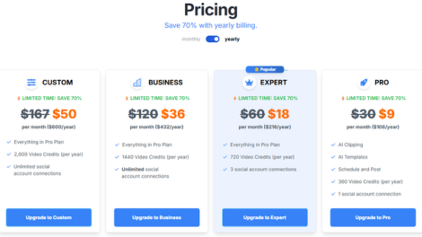 Business: At $36/month (billed $432/year), it provides 1,440 credits and unlimited social account connections.